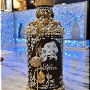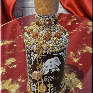 This Casa Maestri Bottle, adorned with dazzling rhinestones and charming dangling accents, is a piece of art that transcends its original purpose. This bottle, with its shimmering exterior, adds a touch of elegance to any space, making it a perfect decor item for those who appreciate beauty and luxury. Whether used as to keep alcohol (not included) or simply as a decorative element, it brings a sense of sophistication to your surroundings. As a collector’s item, it’s not just about the aesthetics but also about owning a piece of fine craftsmanship. Embrace this bottle for its ability to elevate your environment, blending luxury with functionality.