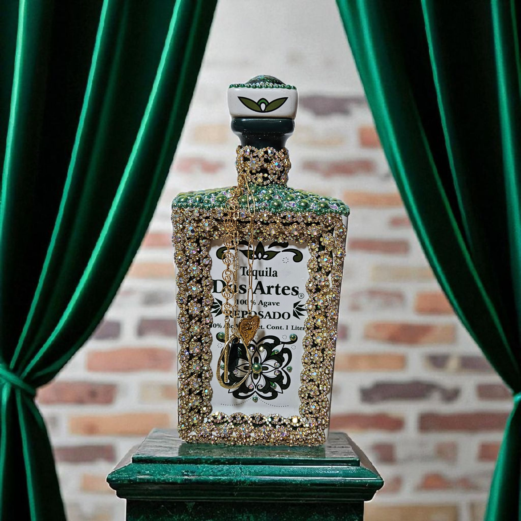 This gorgeous green Dos Artes Tequila Bottle, adorned with dazzling rhinestones, pearls and charming dangling accents, is a piece of art that transcends its original purpose. This bottle, with its shimmering exterior, adds a touch of elegance to any space, making it a perfect decor item for those who appreciate beauty and luxury. Whether used as to keep alcohol (not included) or simply as a decorative element, it brings a sense of sophistication to your surroundings. As a collector’s item, it’s not just about the aesthetics but also about owning a piece of fine craftsmanship. Embrace this bottle for its ability to elevate your environment, blending luxury with functionality.