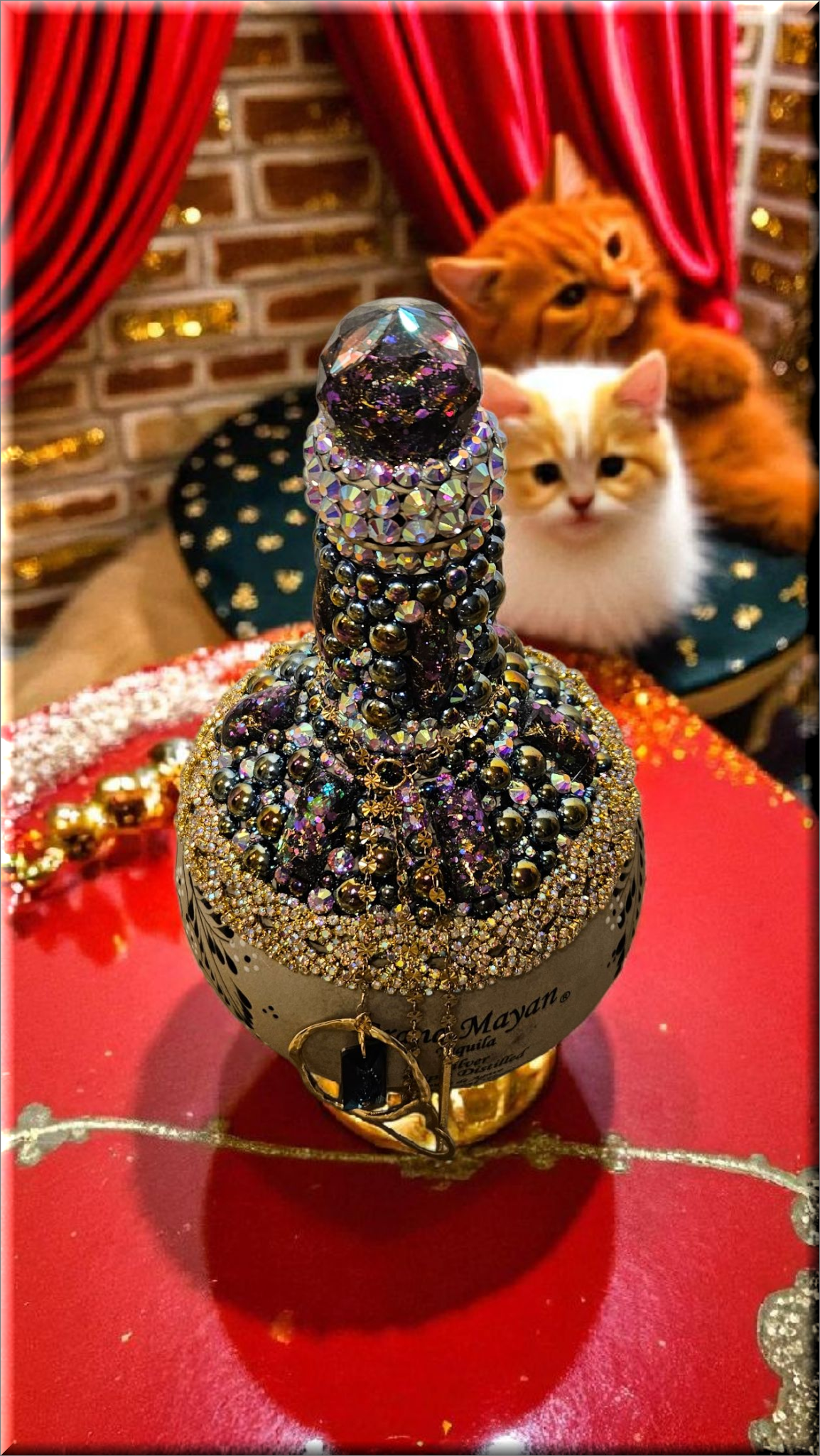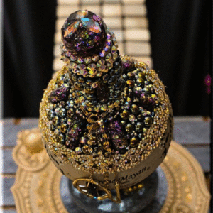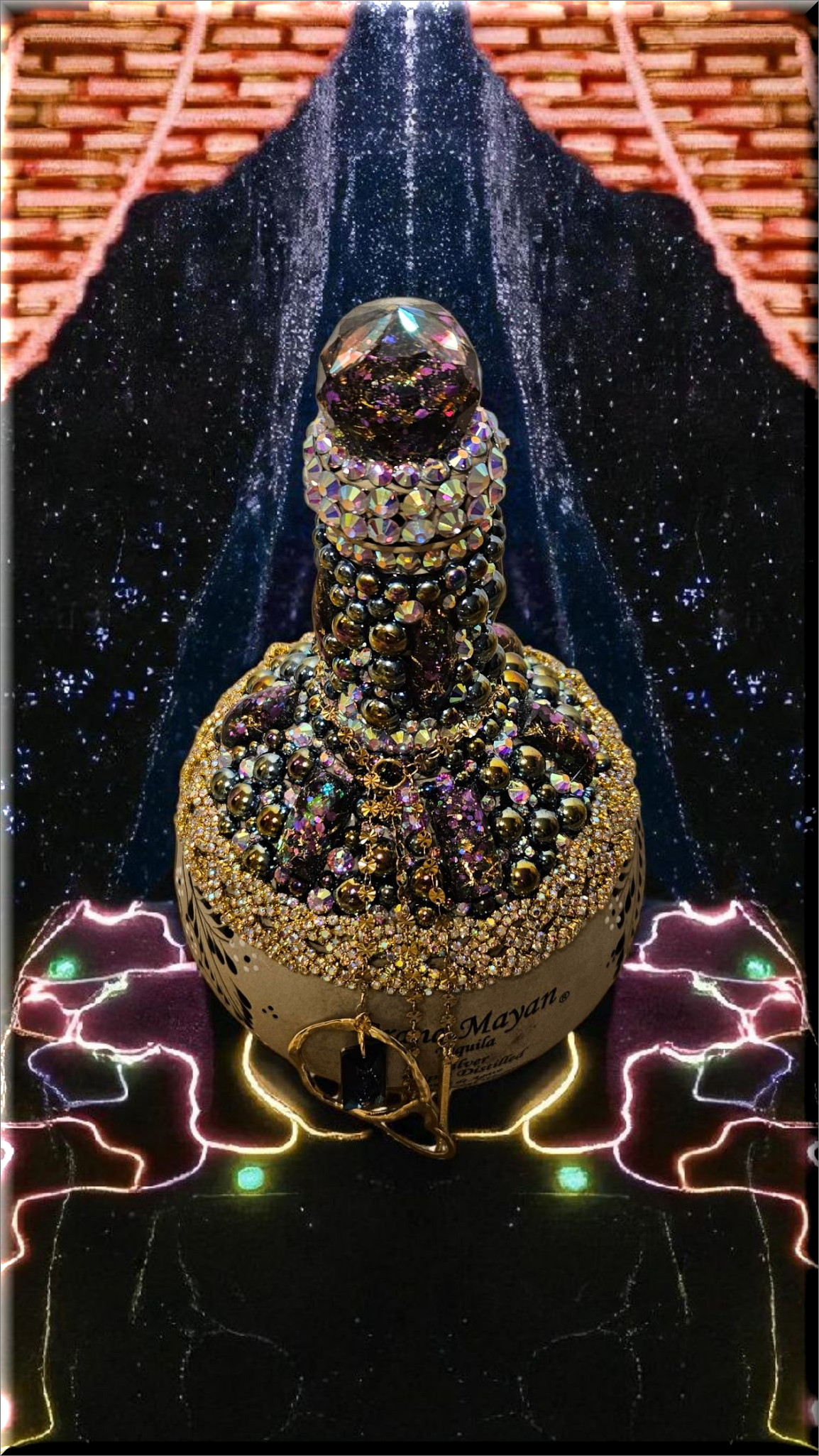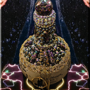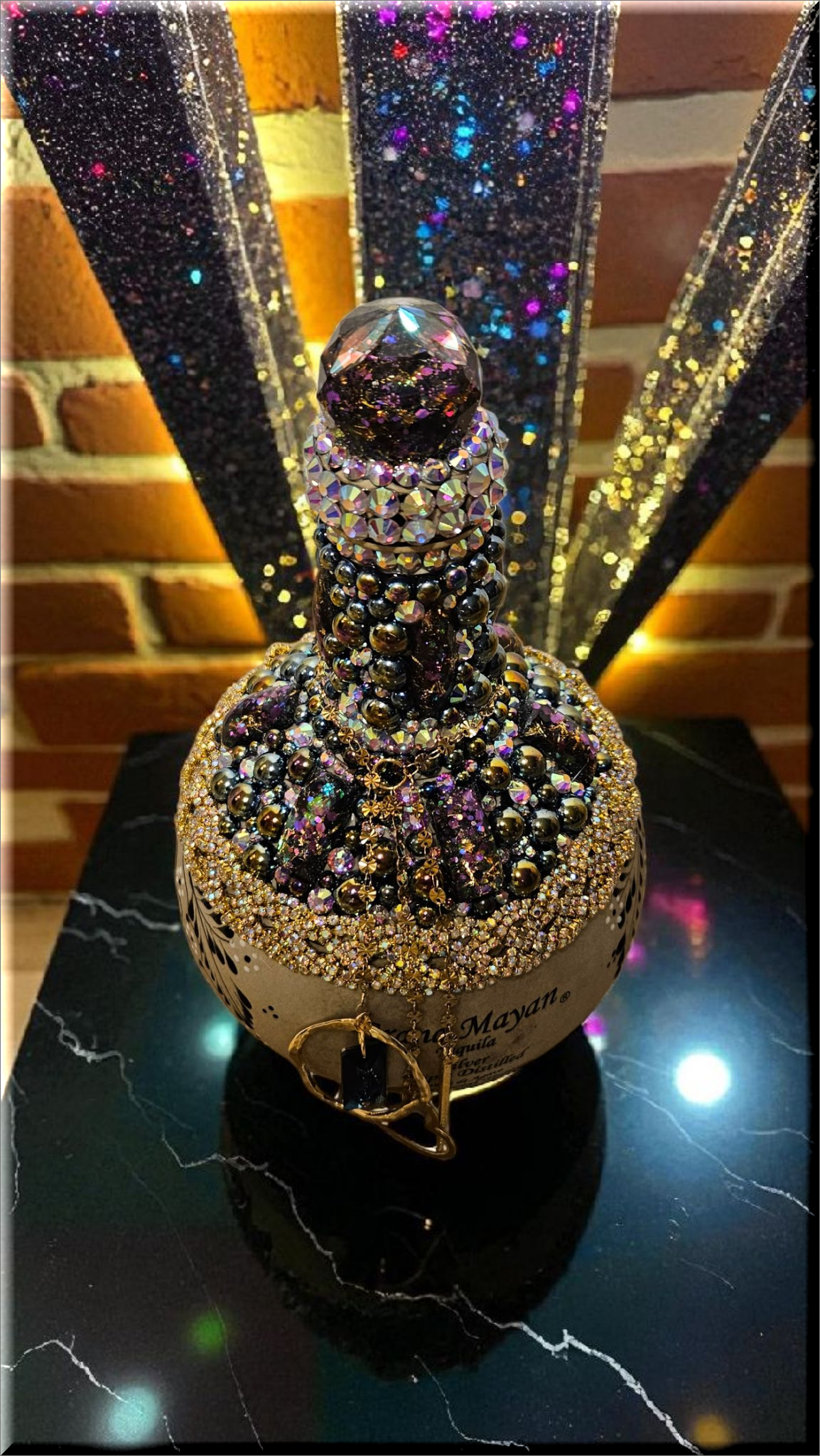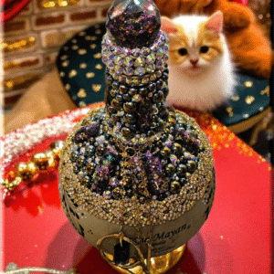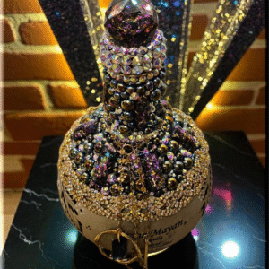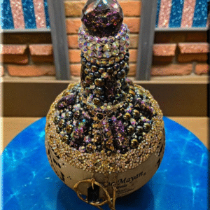 This Grand Mayan Tequila Bottle, adorned with dazzling rhinestones, flat back pearls, cabochons and charming dangling accents, is a piece of art that transcends its original purpose. This bottle, with its shimmering exterior, adds a touch of elegance to any space, making it a perfect decor item for those who appreciate beauty and luxury. Whether used as to keep alcohol (not included) or simply as a decorative element, it brings a sense of sophistication to your surroundings. As a collector’s item, it’s not just about the aesthetics but also about owning a piece of fine craftsmanship. Embrace this bottle for its ability to elevate your environment, blending luxury with functionality.