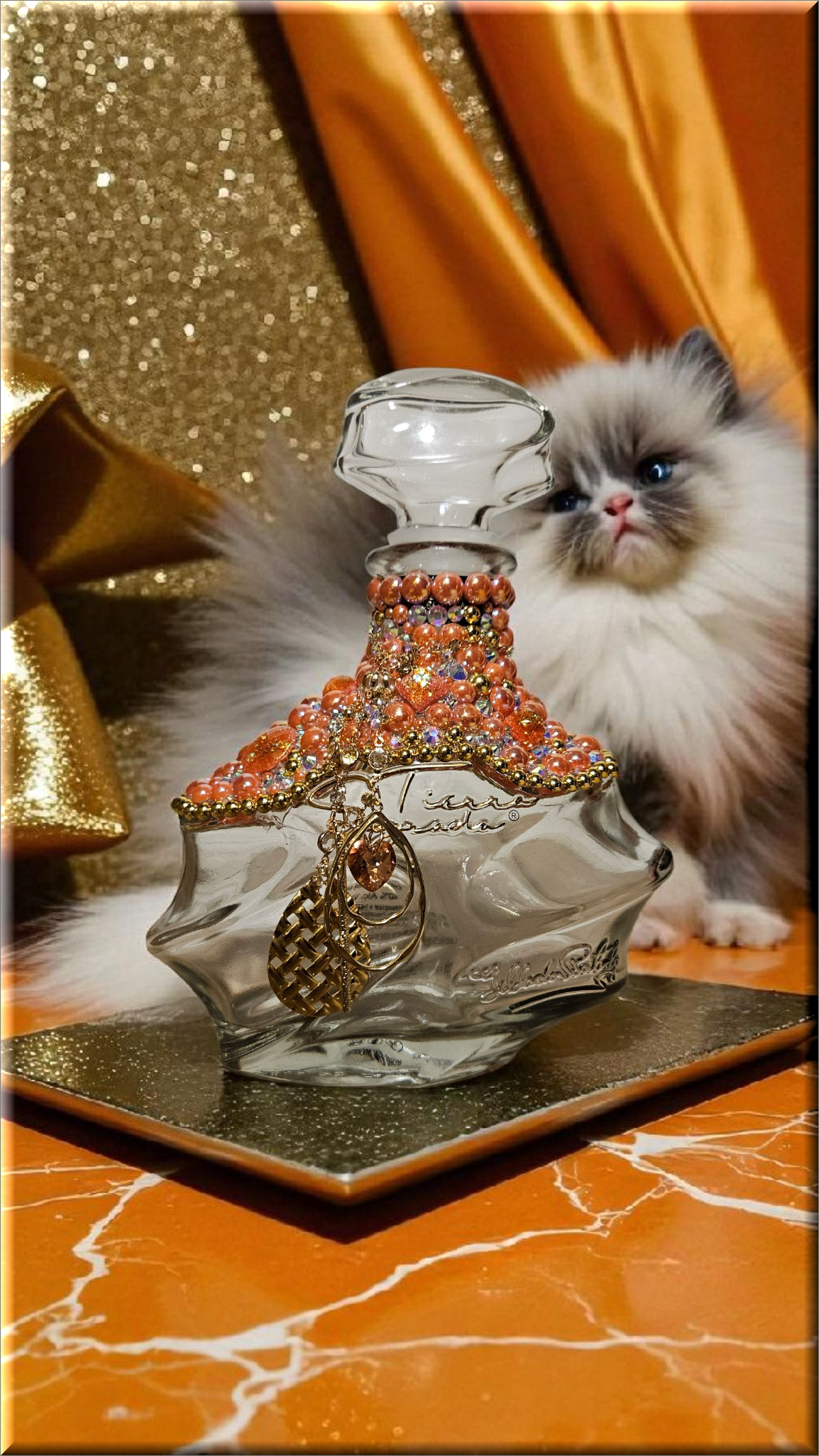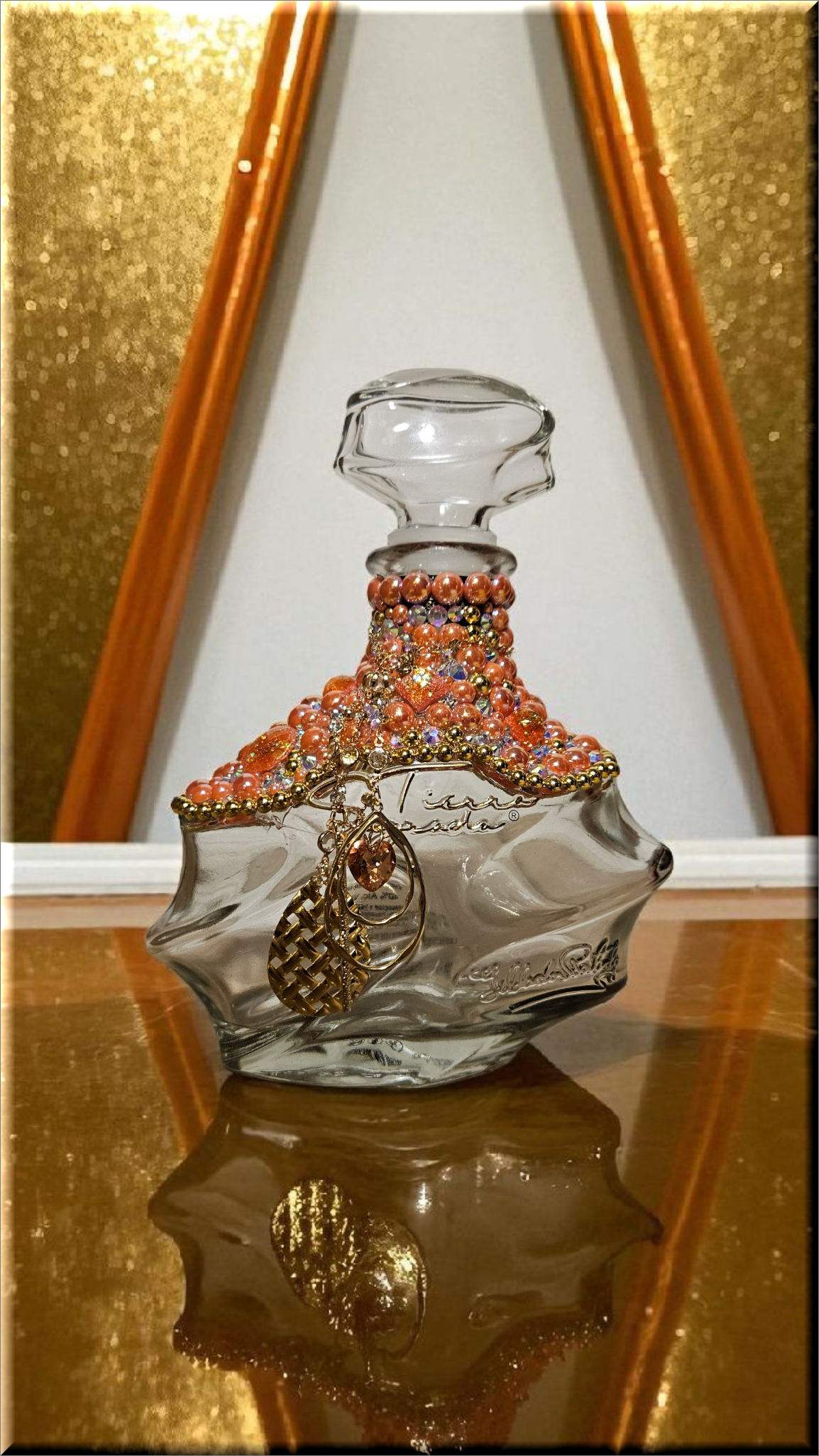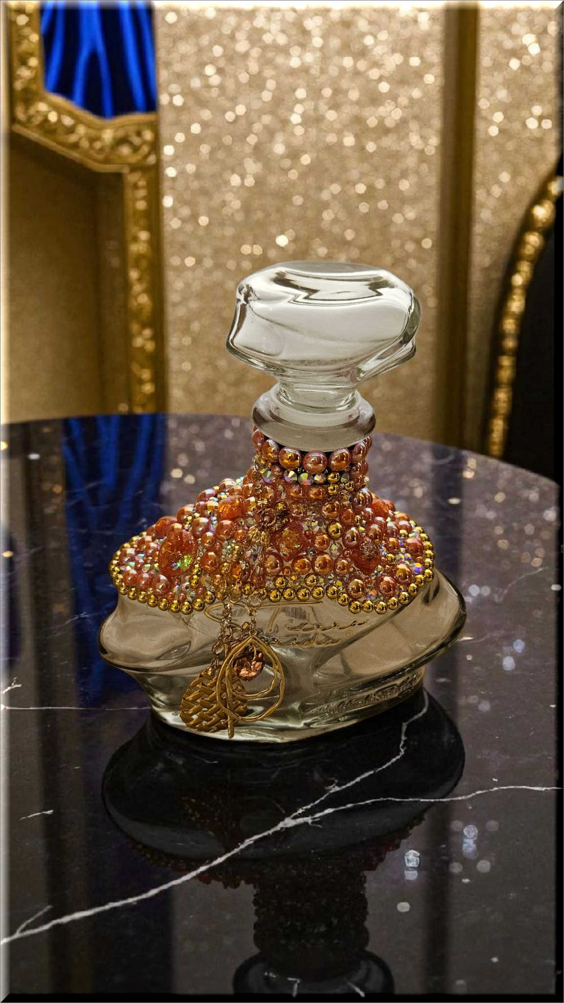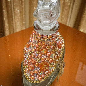 This Mandala Tequila Bottle, adorned with dazzling rhinestones, flat back pearls, cabochons and charming dangling accents, is a piece of art that transcends its original purpose. This bottle, with its shimmering exterior, adds a touch of elegance to any space, making it a perfect decor item for those who appreciate beauty and luxury. Whether used as to keep alcohol (not included) or simply as a decorative element, it brings a sense of sophistication to your surroundings. As a collector’s item, it’s not just about the aesthetics but also about owning a piece of fine craftsmanship. Embrace this bottle for its ability to elevate your environment, blending luxury with functionality.
